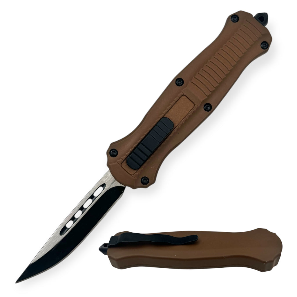 Indulge in the luxurious convenience of our 7.75 inch OTF Brown Drop Point knife, complete with a sleek, 5.22 oz design and a 2.75 inch handle. Its elegant overall length of 7.75 inches and slim width of .75 inches make it the perfect addition to any collection. Plus, enjoy a free Nylon Sheath for easy and stylish transport.