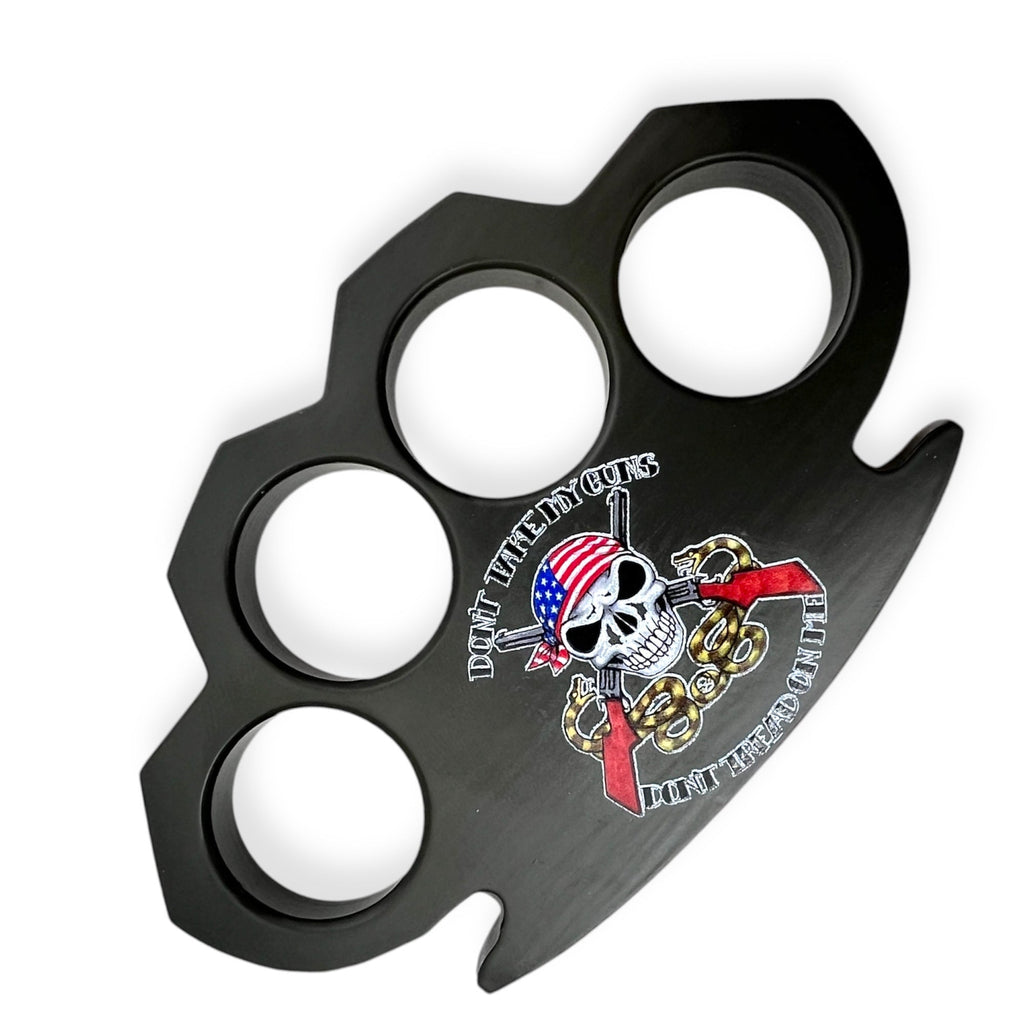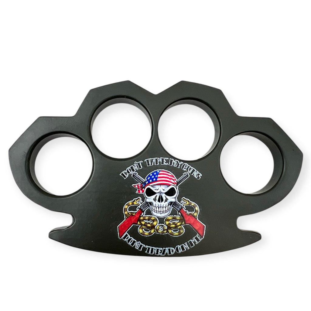 Feel confident and secure with our Don't Take My Guns Brass Knuckles. With a weight of 11 ounces and solid blue steel construction, this 4.5" by 2.75" knuckle ensures your protection and peace of mind. Don't take any chances - arm yourself with the best.