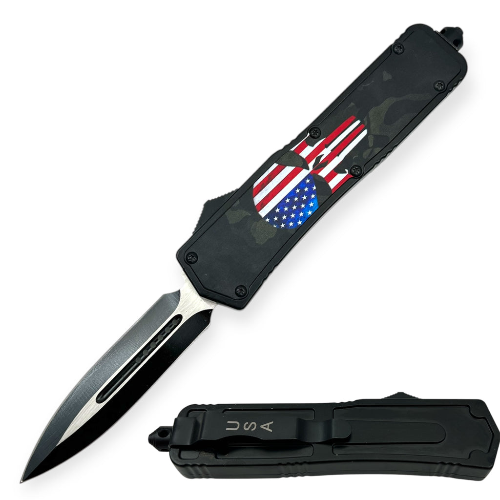 OTF Automatic Knife Punisher Skull w/ Flag Double Edge Blade